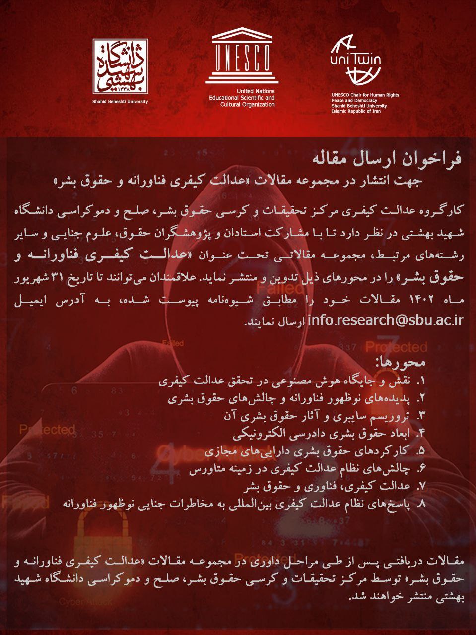 صفحه اصلی فراخوان ارسال مقاله 222127 بازدید print share فراخوان ارسال مقاله جهت انتشار در مجموعه مقالات "عدالت کیفری فناورانه و حقوق بشر" کارگروه عدالت کیفری مرکز تحقیقات و کرسی حقوق بشر،...