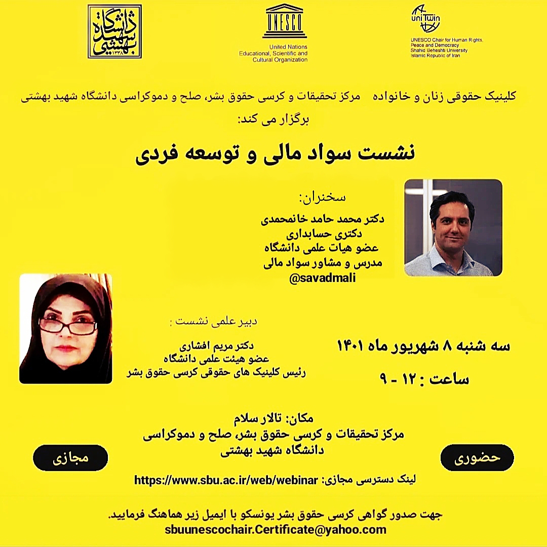 صفحه اصلی کلينيك حقوقي زنان و خانواده مرکز تحقیقات و کرسی حقوق بشر، صلح و دموکراسی دانشگاه شهید بهشتی برگزار می کند: «نشست سواد مالي و توسعه فردي» 9930 بازدید print share کلينيك حقوقي زنان و...
