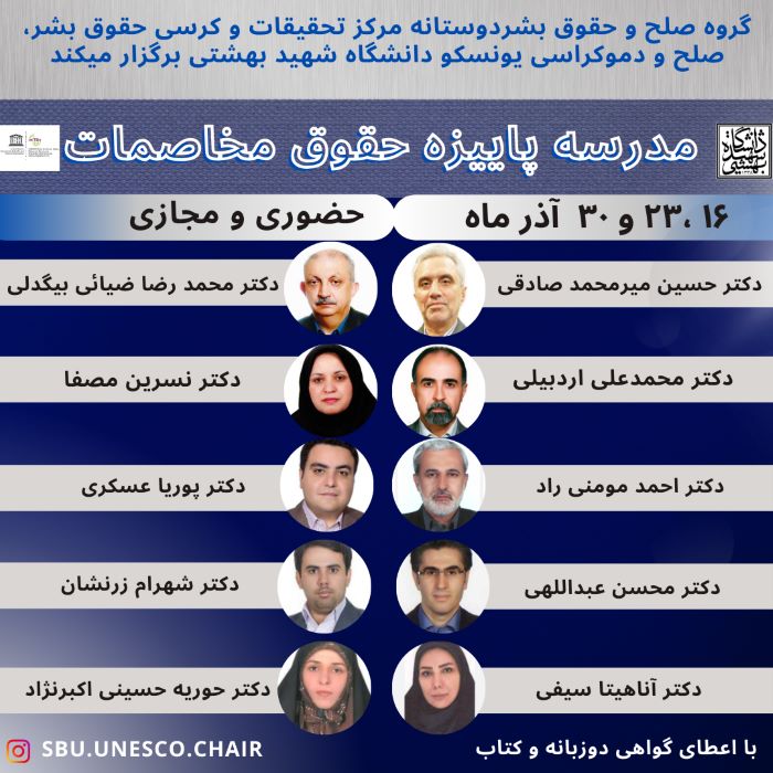 صفحه اصلی روز جهانی حقوق بشر 9285 بازدید print share مركز تحقيقات و كرسي حقوق بشر، صلح و دموكراسي يونسكو دانشگاه شهيد بهشتي با همكاري كميسيون ملي يونسكو، دانشكده حقوق و پژوهشكده خانواده برگزار...