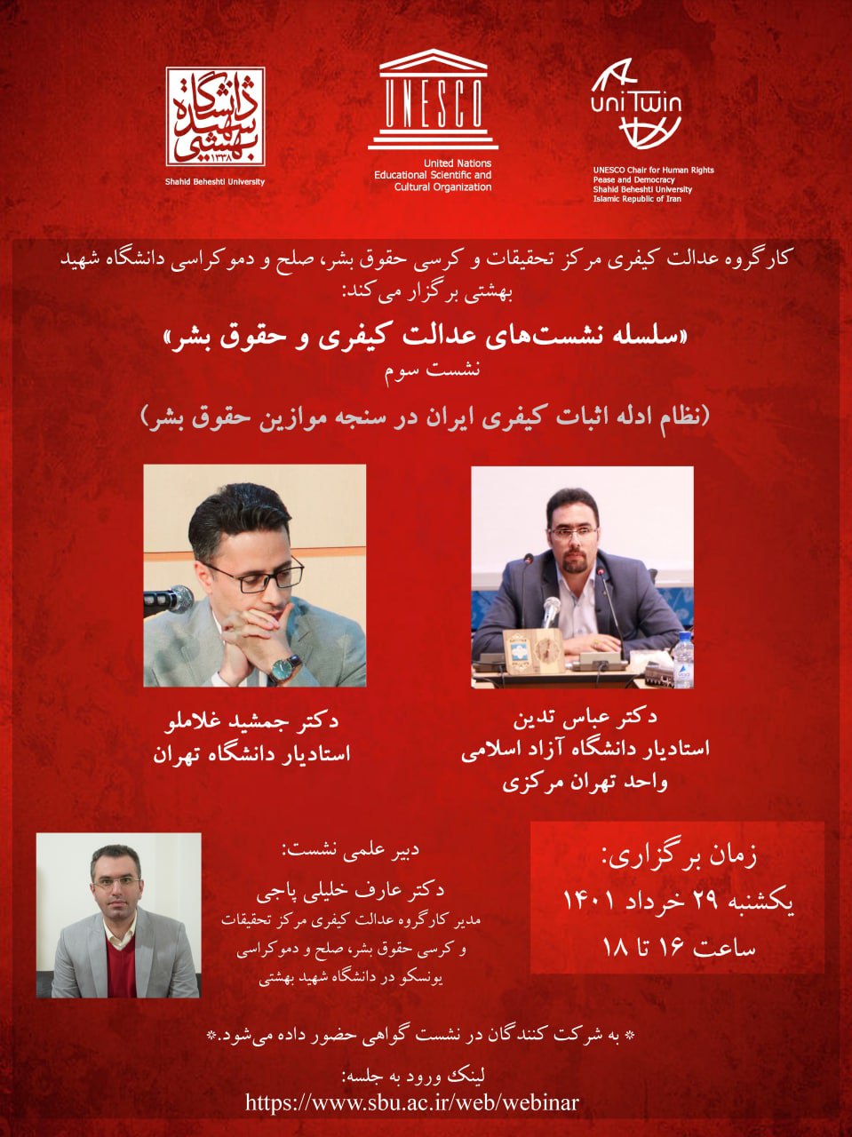 صفحه اصلی «سلسه نشستهای عدالت کیفری و حقوق بشر» 22387 بازدید print share کارگروه عدالت کیفری مرکز تحقیقات و کرسی حقوق بشر، صلح و دموکراسی دانشگاه شهید بهشتی برگزار می کند: «سلسه نشستهای عدالت...