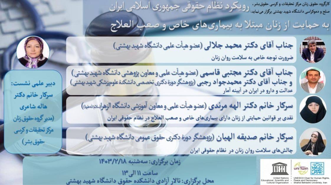 کارگروه حقوق زنان مرکز تحقیقات و کرسی حقوق بشر، صلح و دموکراسی دانشگاه شهید بهشتی برگزار میکند: