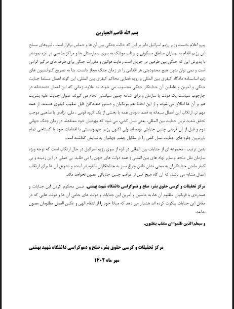 مرکز تحقیقات و کرسی حقوق بشر صلح و دموکراسی دانشگاه شهید بهشتی ضمن محکوم کردن این جنایات و همدردی با قربانیان مظلوم آن‌ها به عاملین و آمرین این جنایات و دولت‌های حامی آن‌ها و دولت‌هایی که در مقابل این جنایات سکوت کرده‌اند هشدار می‌دهد که مبادا خود را از انتقام الهی و عکس العمل مظلومان مصون بدانند.