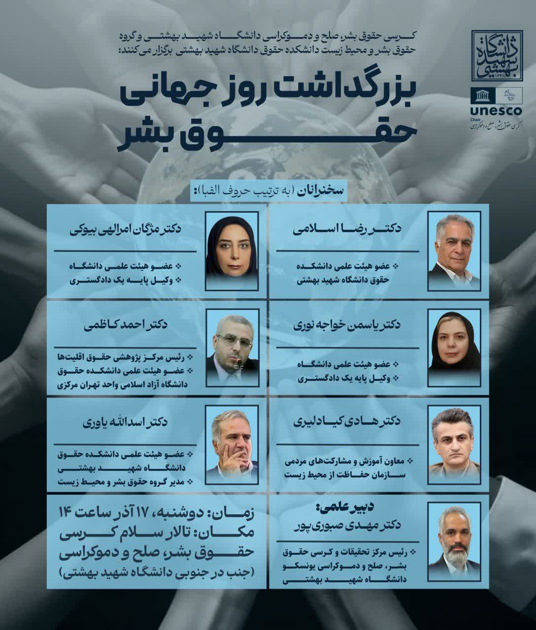 مرکز تحقیقات و کرسی حقوق بشر، صلح و دموکراسی دانشگاه شهید بهشتی و گروه حقوق بشر و محیط زیست دانشکده حقوق دانشگاه شهید بهشتی برگزار می‌کنند: