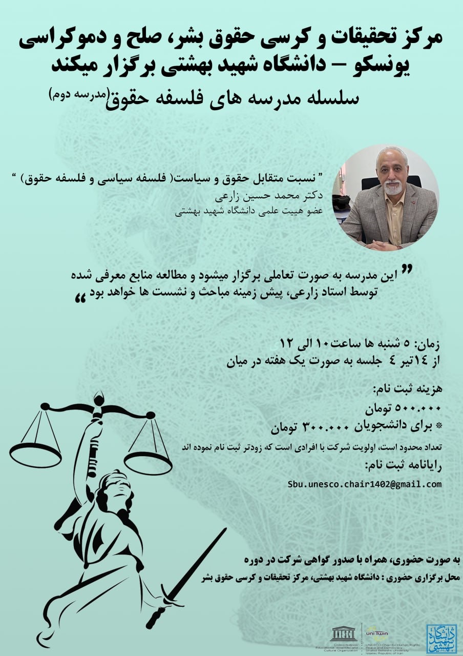 مدرسه دوم از سلسله مدرسه های فلسفه حقوق از ۱۴ تیر ۴ جلسه همراه با صدور گواهی شرکت حضور این مدرسه جهت ثبت نام و دریافت اطلاعات با رایانامه: Sbu.unesco.chair1402@gmail.com در ارتباط باشید