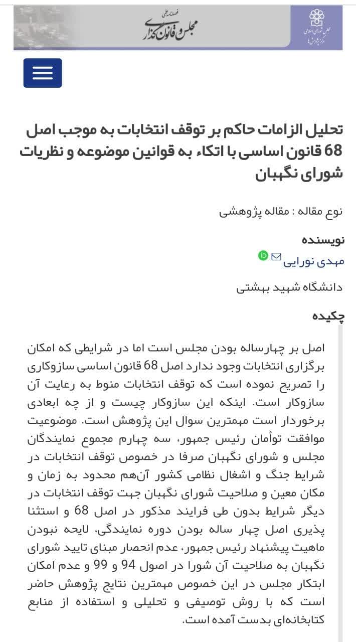 سومین مقاله دکتر مهدی نورایی عضو هیئت علمی مرکز توسط فصلنامه علمی مجلس و قانونگذاری در سال 1403 با عنوان «ابعاد و آثار ادواری بودن مجلس در جمهوری اسلامی ایران در پرتو اصل 63 قانون اساسی مبتنی بر...