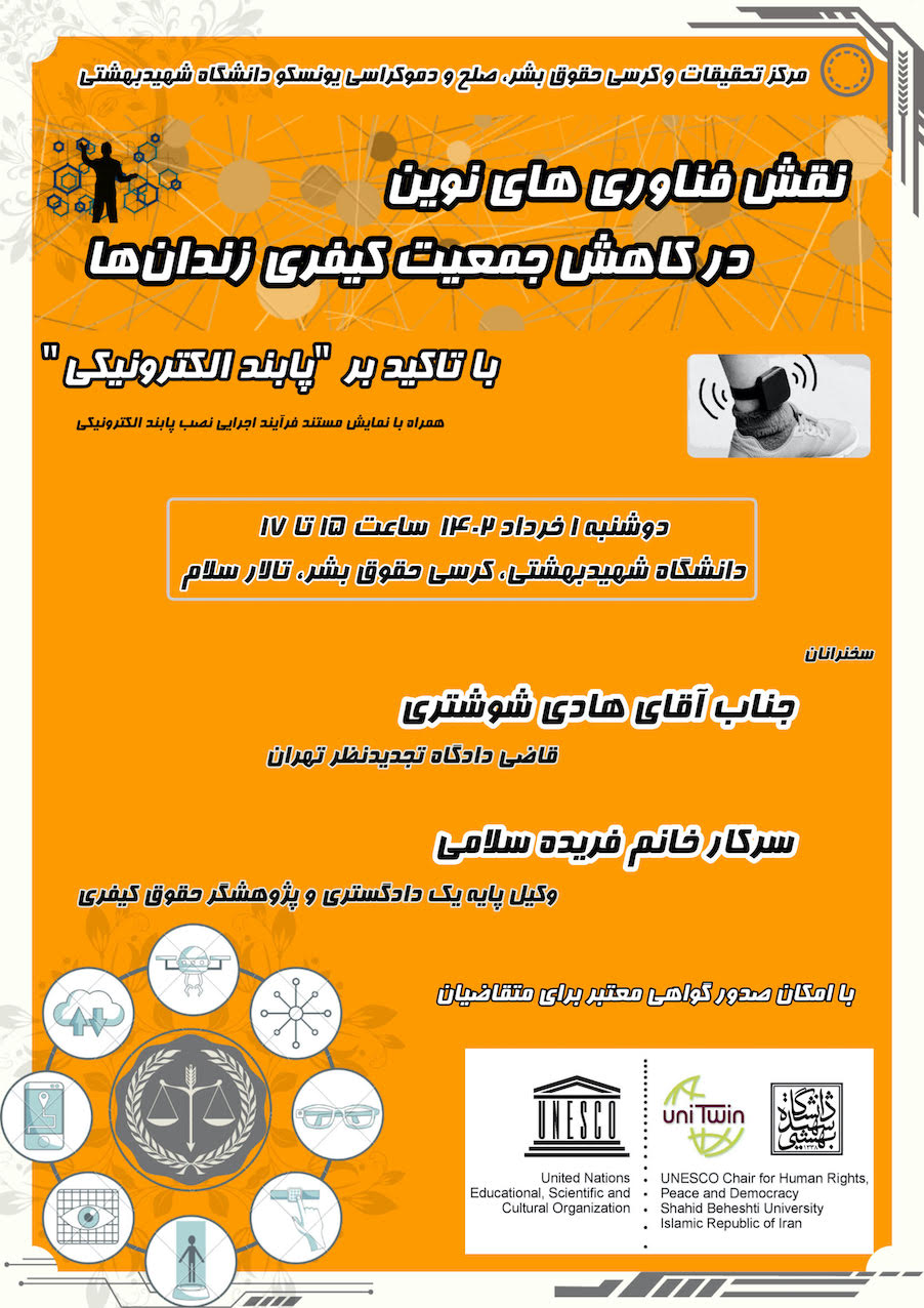 صفحه اصلی نقش فناوری های نوین در کاهش جمعیت کیفری زندان ها 12966 بازدید print share مرکز تحقیقات و کرسی حقوق بشر، صلح و دموکراسی دانشگاه شهید بهشتی برگزار میکند: نشست تخصصی نقش فناوریهای نوین در...